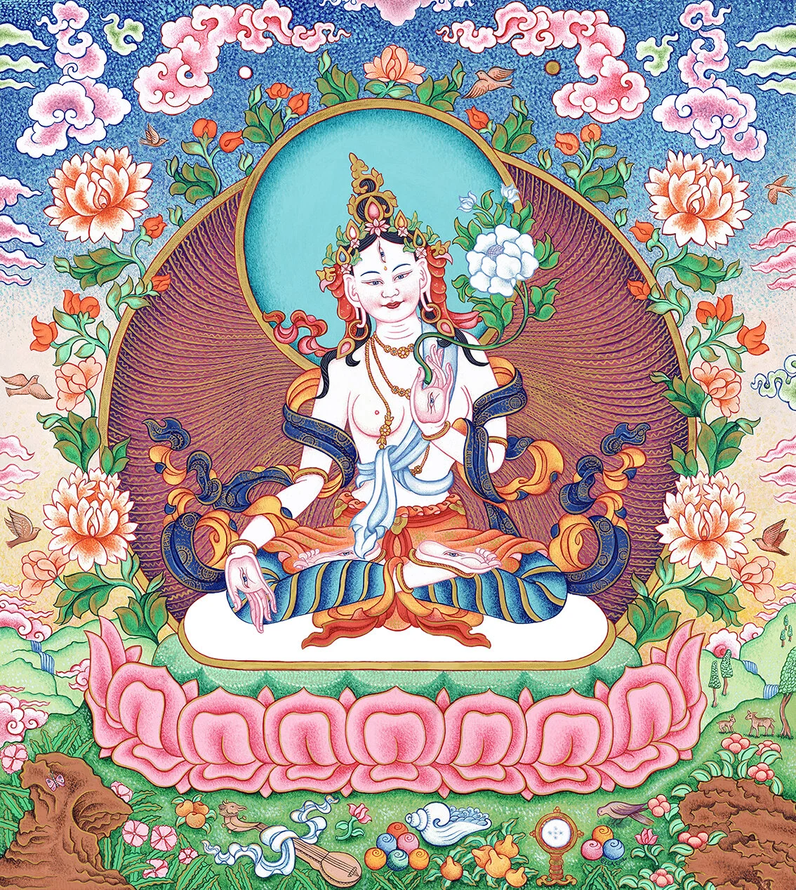 While teaching Art at Tikipunga High School in her home town of Whangarei, Ella began studying Buddhist philosophy. She then traveled to India to attend teachings from the Dalai Lama. She settled in the Lake District, UK in order to take up a classical thangka painting apprenticeship offered by Andy Weber, and is now a lineage holder of this tradition. More recently Ella has developed mindfulness practices for secondary schools and teaches Art at Epsom Girls Grammar School.