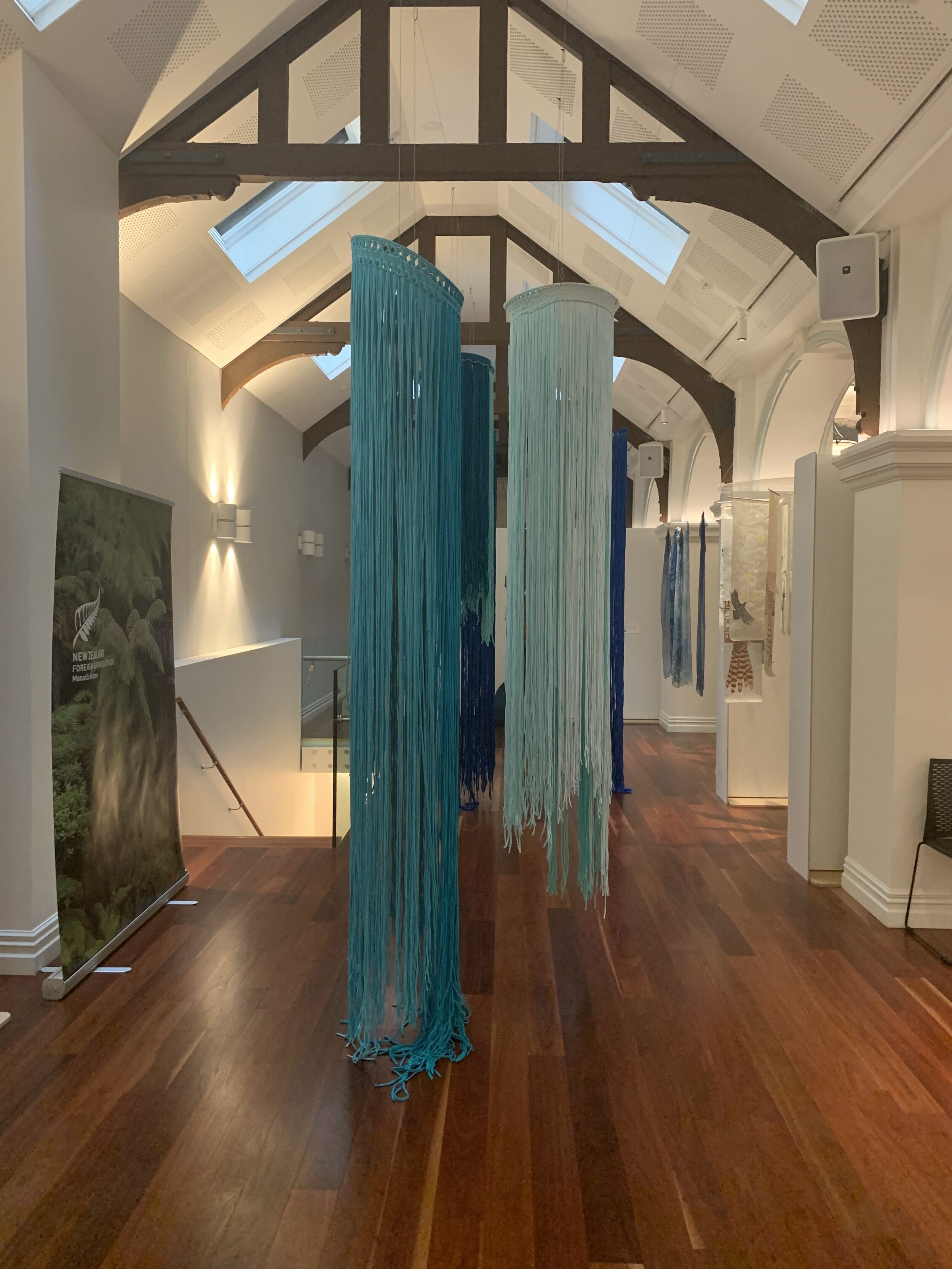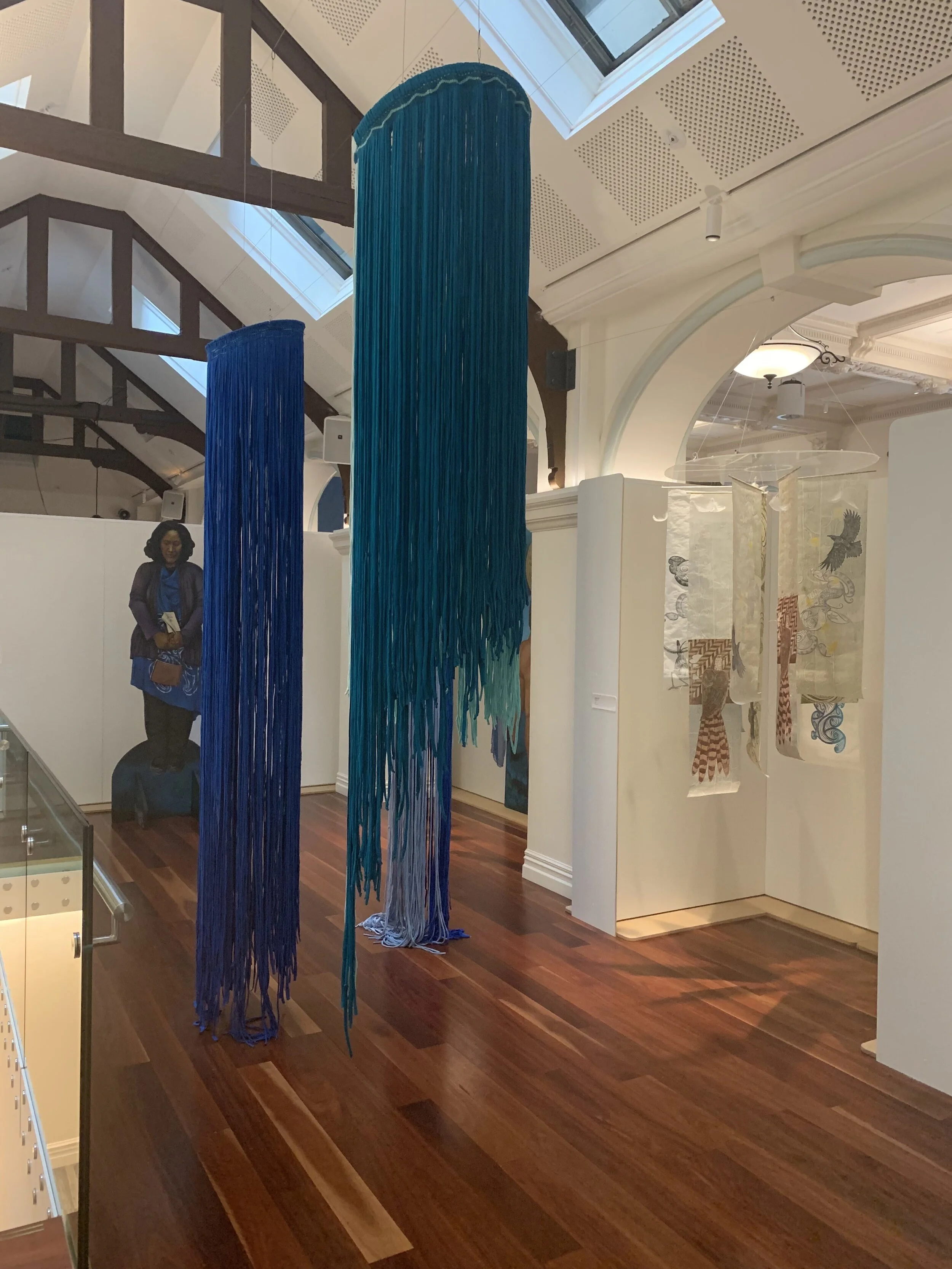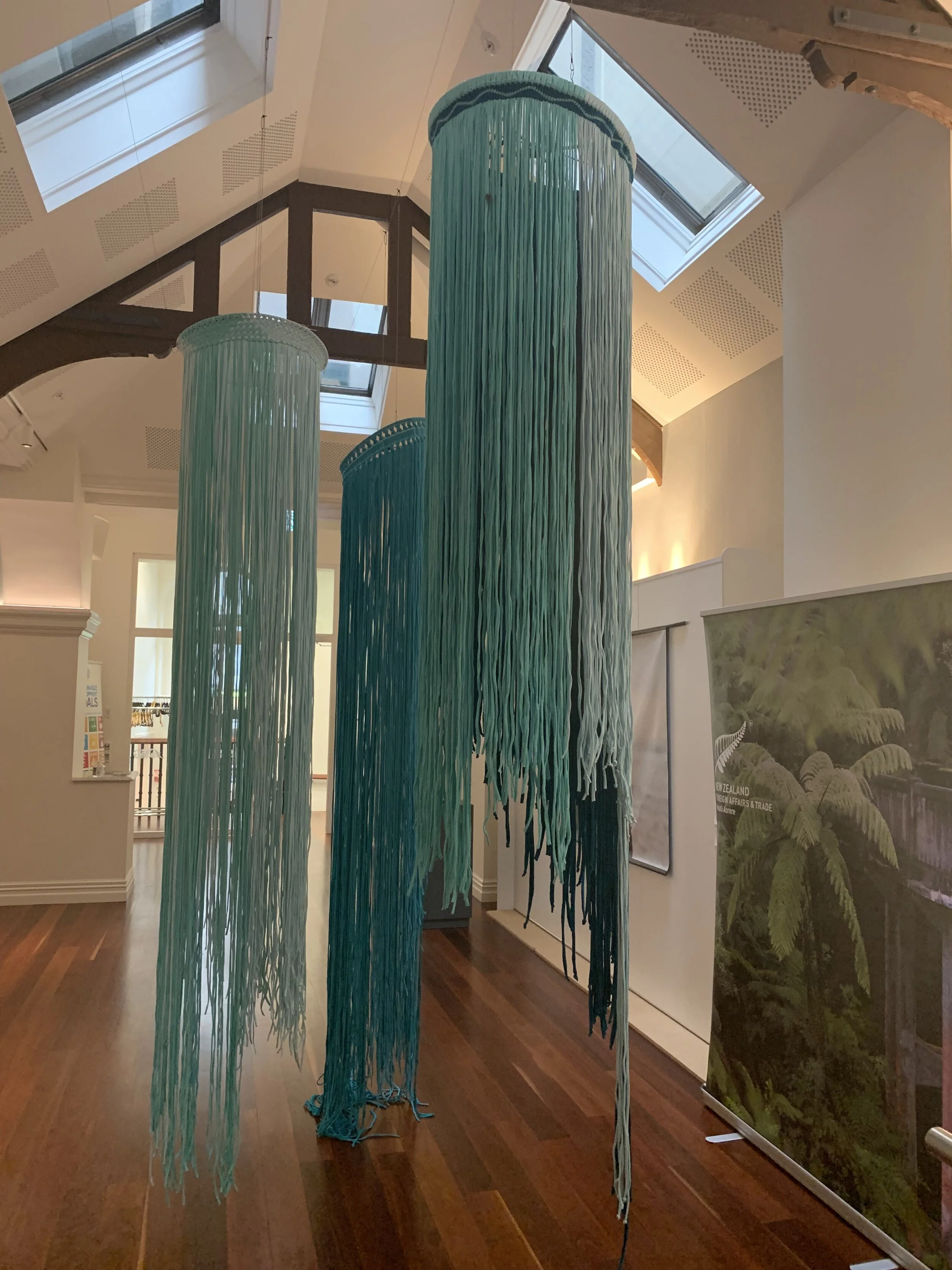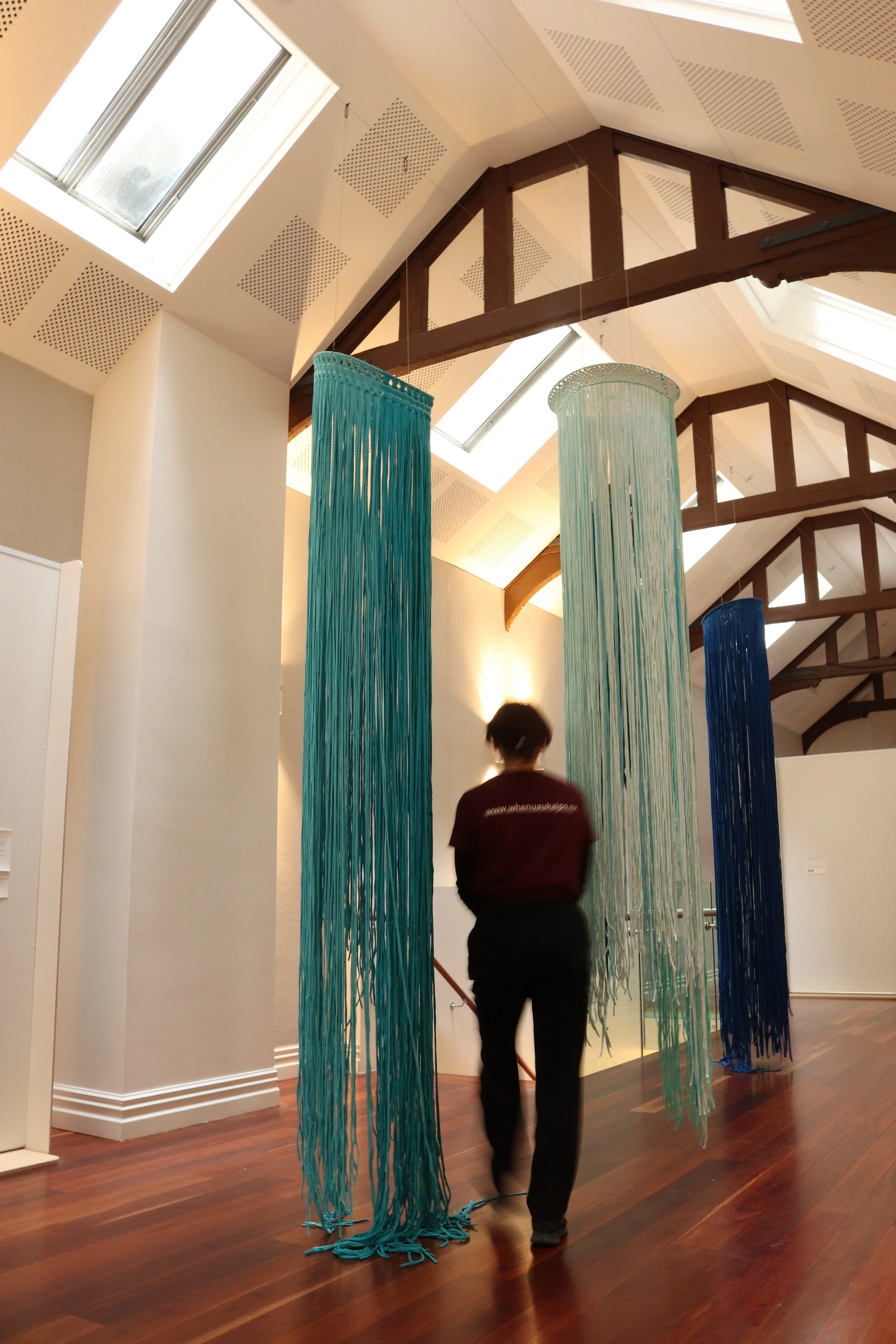 The works are made with found materials, recycled t-shirt material as a further conversation into being sustainable and responsible citizens to our whenua.